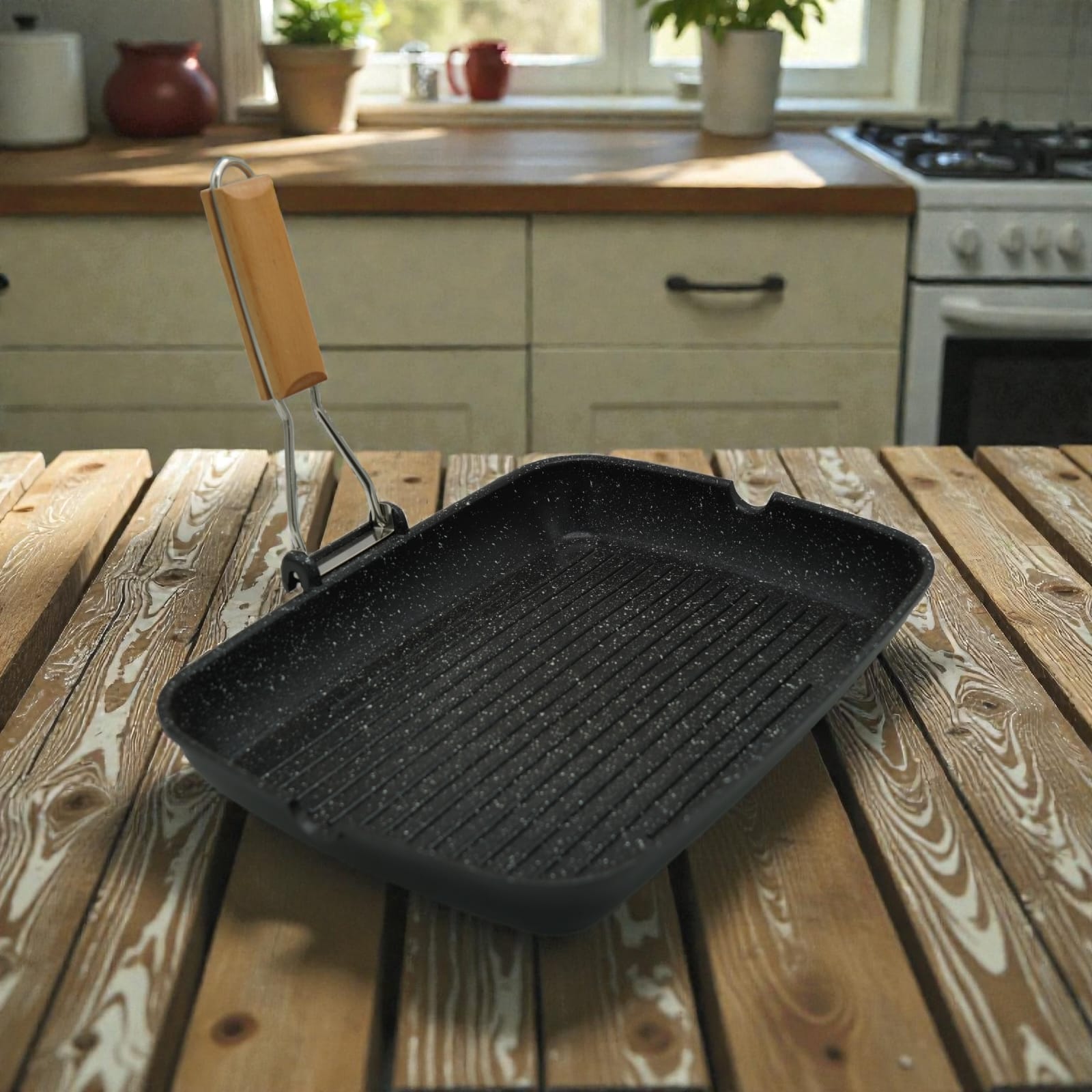 The 36cm Marble-Coated Grill Pan with Induction Plate and Foldable Handle is perfect for versatile cooking on all stovetops, including induction. The durable marble coating ensures even heat distribution and prevents sticking, while the foldable handle offers convenient storage and easy handling. Ideal for grilling meats, vegetables, and sandwiches, this pan combines style, functionality, and practicality for everyday cooking.